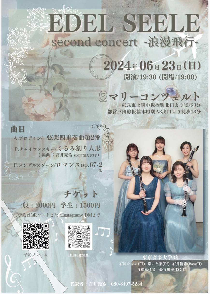 東京都板橋区にあるマリーコンツェルトでEDEL SEELE second concert~浪漫飛行∼の演奏会を開催しました。ゲストピアニストとして、同期の東京音楽大学ピアノ演奏家コース、礒こと葉さんをお迎えし、また、同期のファゴット専攻、髙井亮祐さんに編曲していただいたくるみ割り人形を演奏しました。